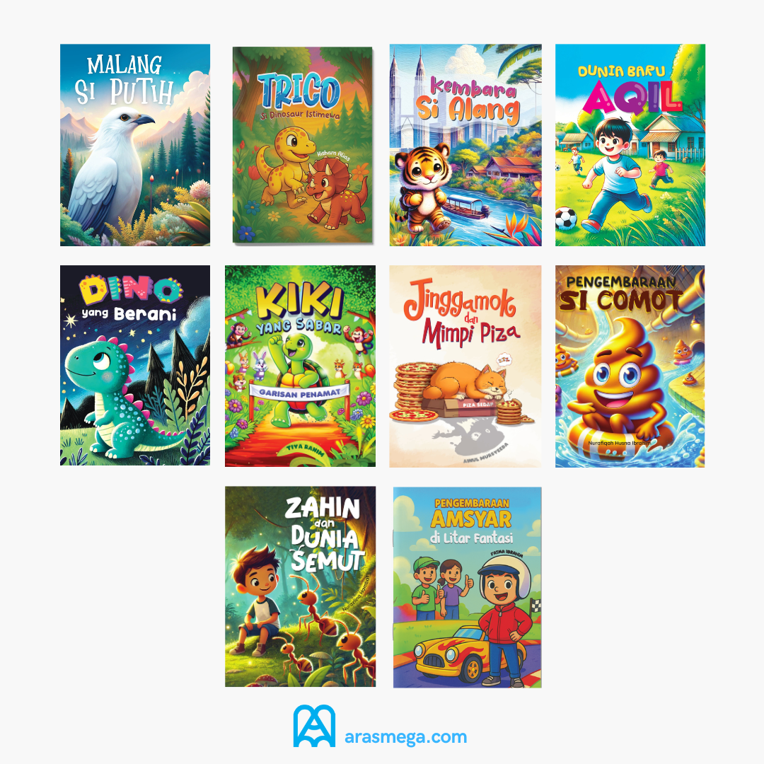 Koleksi 10 buku cerita kanak-kanak ini penuh dengan keseronokan, pengembaraan, dan pengajaran mudah dalam kehidupan. Kanak-kanak akan berjumpa dengan haiwan yang boleh bercakap, wira kecil yang berani, pari-pari ajaib, dan rakan-rakan baik yang mengajar tentang nilai murni seperti kebaikan, kejujuran, keberanian, dan tidak mudah putus asa. Setiap cerita ditulis dalam Bahasa Inggeris yang mudah difahami, dengan ilustrasi hitam putih yang menarik. Lebih istimewa, kanak-kanak boleh membaca dan mewarna pada masa yang sama, menjadikan pengalaman membaca lebih seronok, kreatif, dan penuh imaginasi.