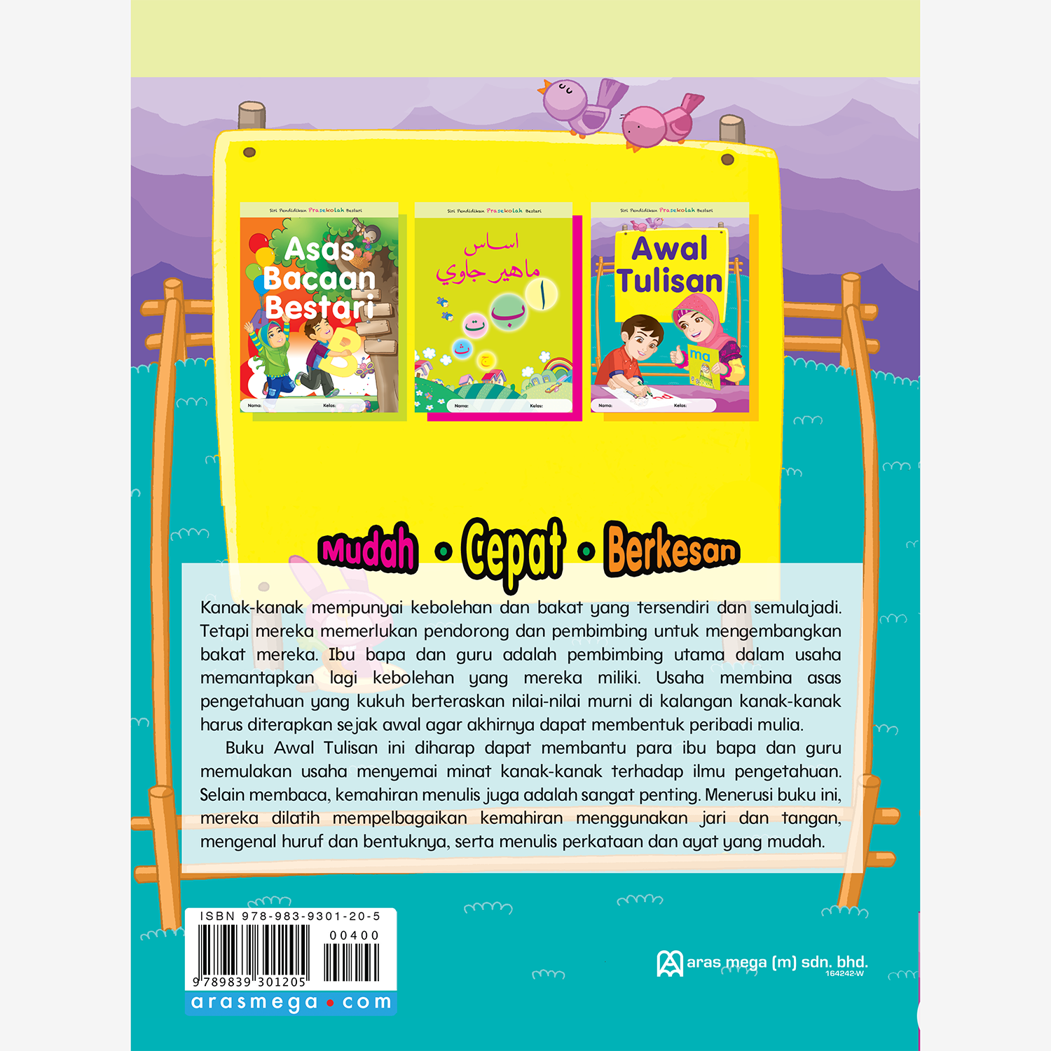 Buku ini dapat membantu para ibu bapa dan guru memulakan usaha menyemai minat kanak-kanak terhadap ilmu pengetahuan. Selain membaca, kemahiran menulis juga adalah sangat penting. Menerusi buku ini, mereka dilatih mempelbagaikan kemahiran menggunakan jari dan tangan, mengenal huruf dan bentuknya, serta menulis perkataan dan ayat yang mudah.