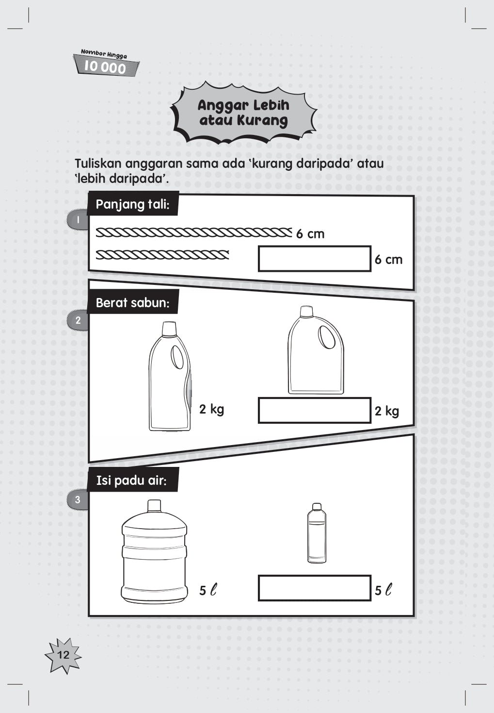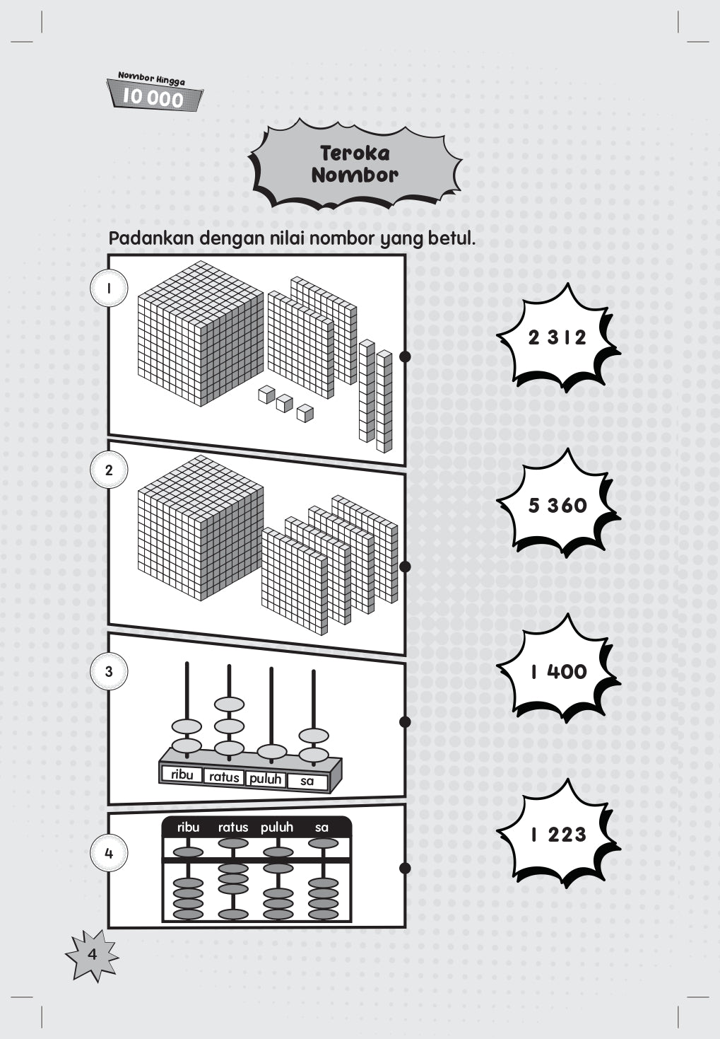 ‘Nombor Hingga 10 000 ialah buku latihan Matematik yang merangkumi soalan-soalan pemantapan awal murid Tahun 3. Kandungan topik yang disediakan merupakan asas yang mesti dikuasai murid sebelum mempelajari bab seterusnya seperti mengenal, menulis dan mengeja nombor hingga 10 000, cerakin mengikut nilai tempat atau nilai digit, membanding nombor lebih besar atau kecil, menganggar kuantiti objek, menyusun menaik atau menurun dan membundar nombor kepada puluh, ratus atau ribu terdekat.